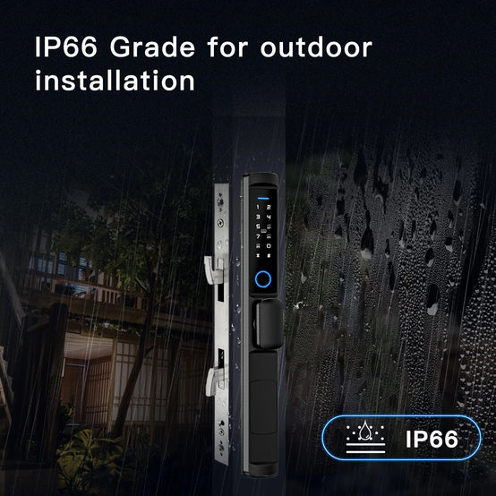 WiFi Bridge Aluminum Door Lock 1.Unlock by Password Fingerprint, IC/NFC Card, Emergency Mechanical Key 2.304# stainless steel lock paneland handle 3.IP65 Waterproof for outdoor 4.Default with 3585 Mortise.[ 35/85,45/85,50/85,60/85,70/85)] optional. 5.Work with alkaline battery 6.Emergency key for backup use 7.300,000 times life test 8.Support dynamic and temporary passcode 9.Support virtual passcode