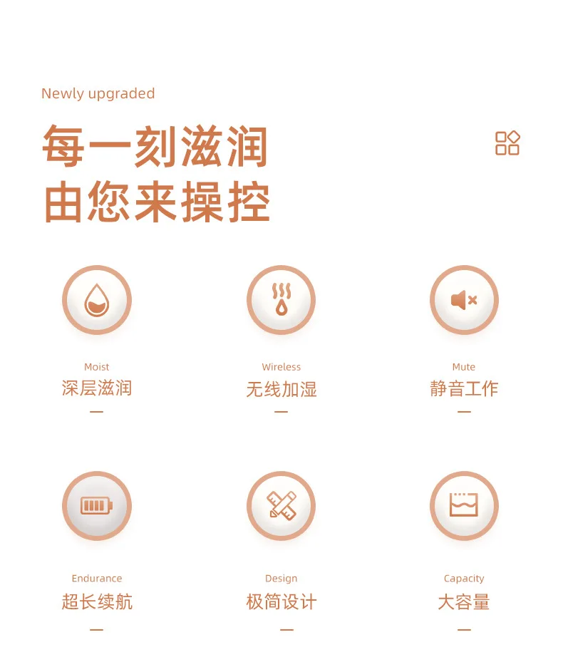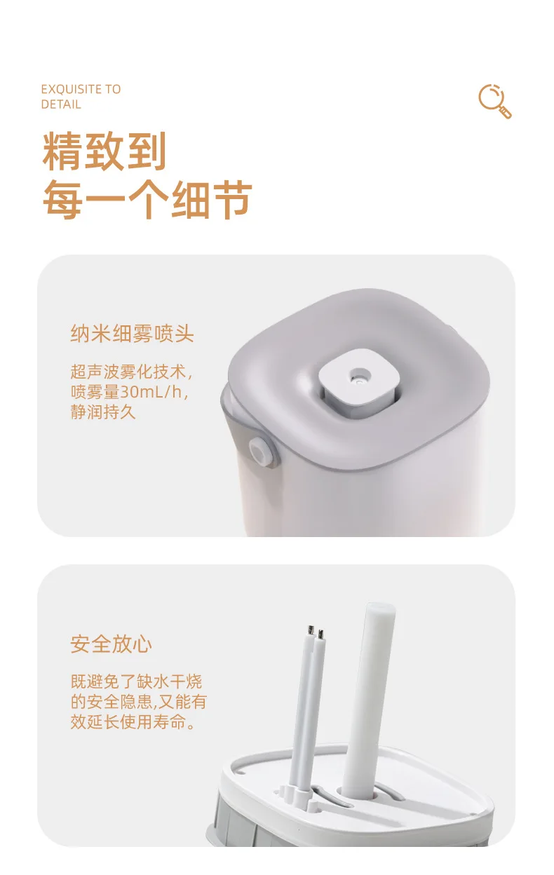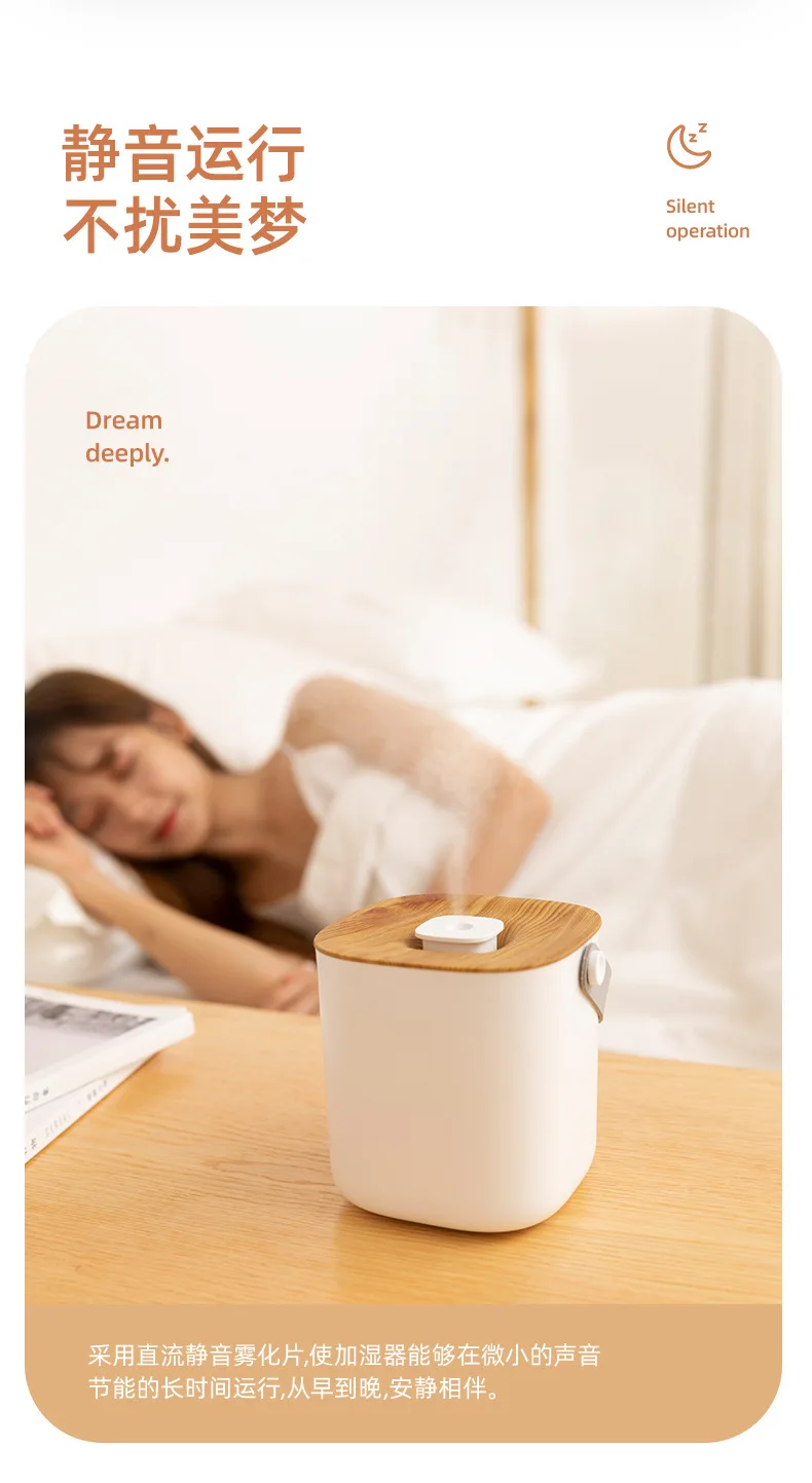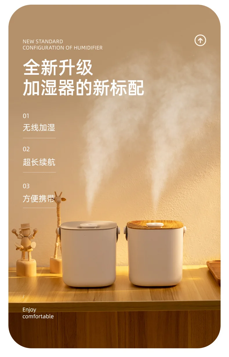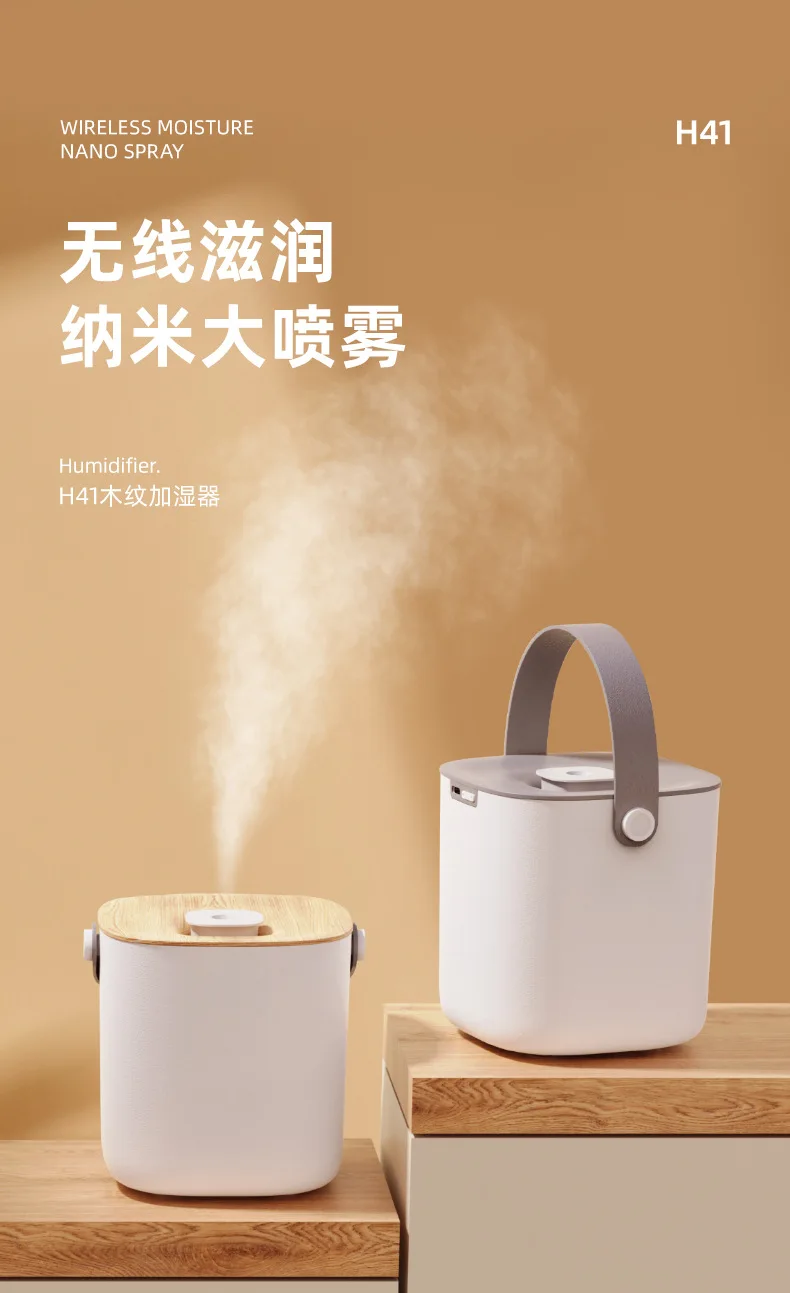 Simulation wood grain surface cover/leather belt portable/desktop multi-scene use 600mL large-capacity water tank / can be filled with water / built-in anti-dry probe Built-in battery, wooden-grain model 2000 mAh/grey model 1200 mAh Product information Product name Wood grain humidifier Product model WT-H41 Material ABS+Leather Packing number/ QTY/CTN 48PCS Product size 122*110*117.5mm Color box size 123*112*121mm Carton size 51.5*47.3*38cm Single net weight N.W/gross weight G.W 289g/374g FCL net weight N.W/gross weight G.W 17.5kg/18.3kg Product color gray wooden-grain
