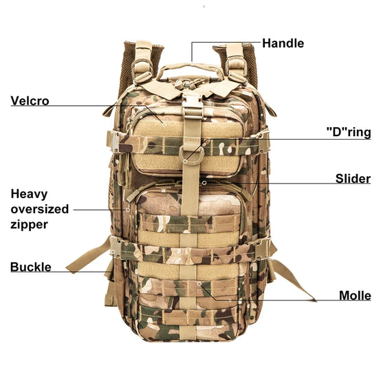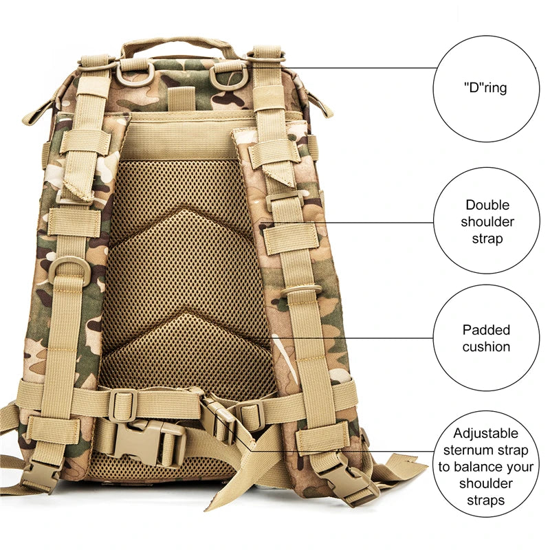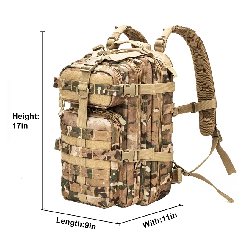*The small assault bag is very outdoor enthusiast. This package has four expandable compartments that can provide up to 26 liters of storage space. The internal partition and zipper pocket are built into the three largest compartments. The mesh padded back plate can accommodate up to 2.5 liters of hydrated bladder (excluding the bladder). The well-defined shoulder straps are padded with mesh and can also be fully adjusted. The waistband and sternum evenly distribute the weight load. The Molle system binds this tactical backpack with custom points, making it the perfect foundation for functional tactical backpacks. Tactical backpackck