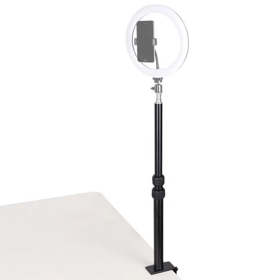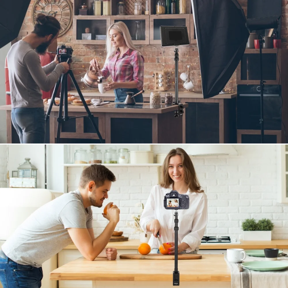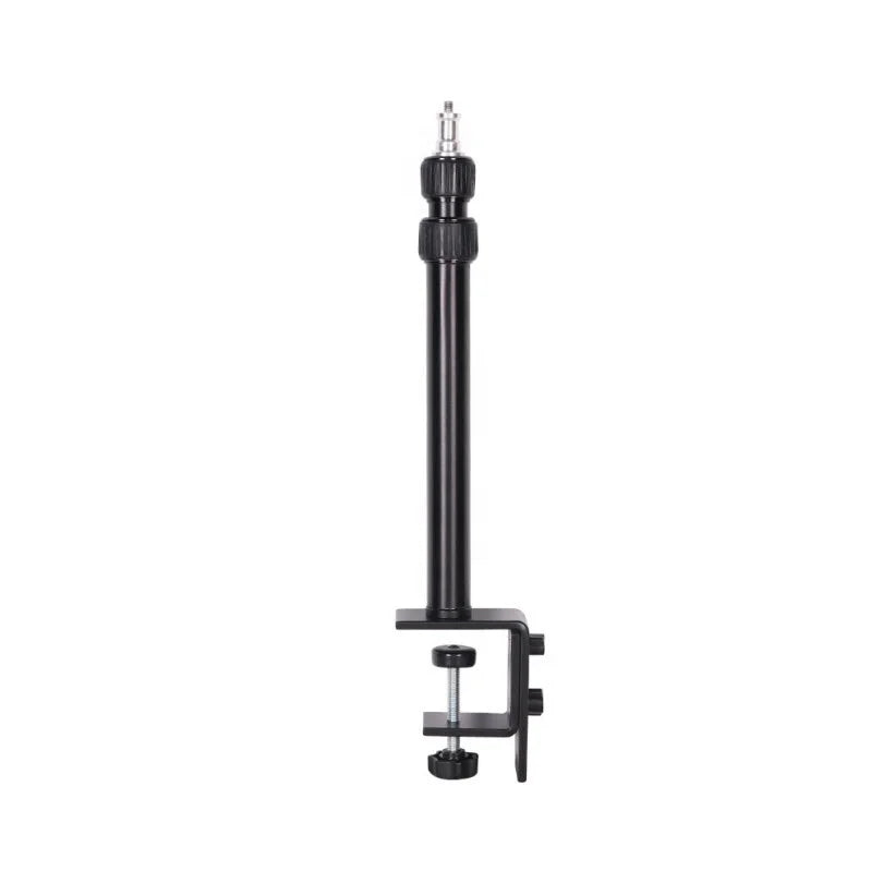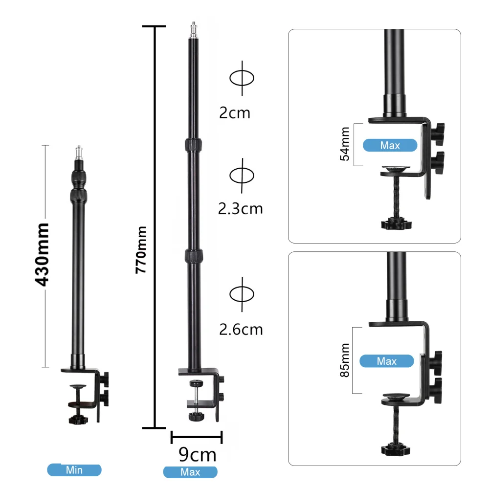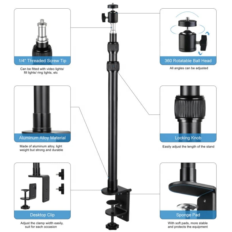 2. Camera desk mount stand 41-77cm adjustable. Gives you ample height for overhead shooting and lighting. Universal desktop light stand, 5cm clip distance, compatible with most of desks.