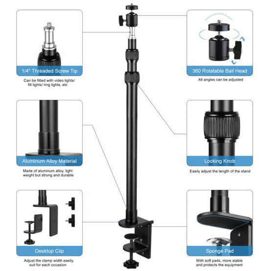 3. Desk clamp stand have removable ball head with an industry-standard 1/4" Screw allows you to expand your rig.