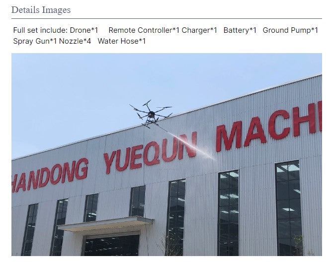 Full set include: Drone*1 Remote Controller*1 Charger*1 Battery*1 Pump*1 Spray Gun*1 Nozzle*4 Water Pipes*1
