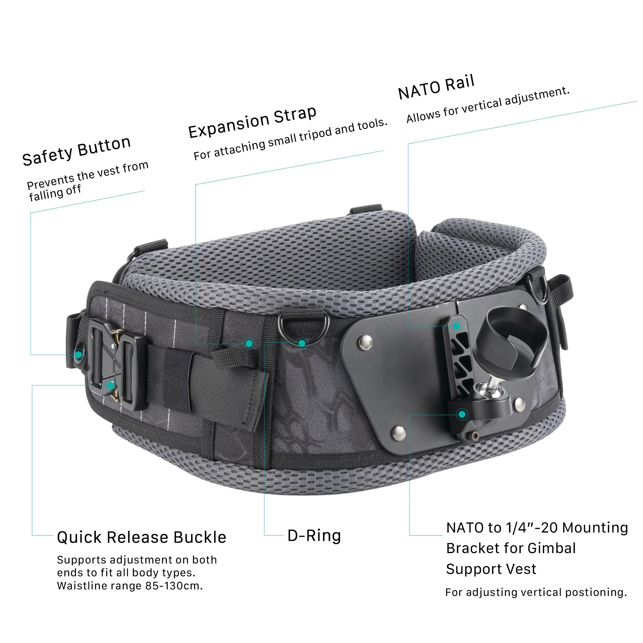 *The Waist Vest features a height adjustable adapter that allows you to mount the DJI RS2, RSC2, RS3 or RS3 Pro via the bottom of the battery handle or the extended grip tripod.