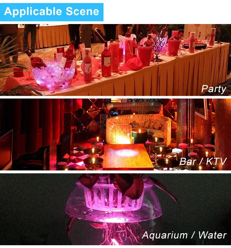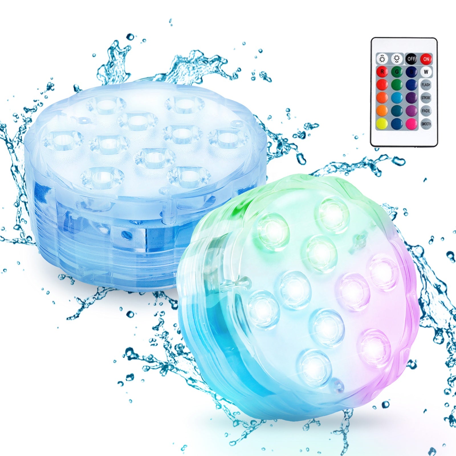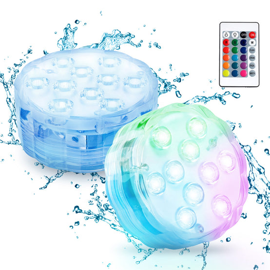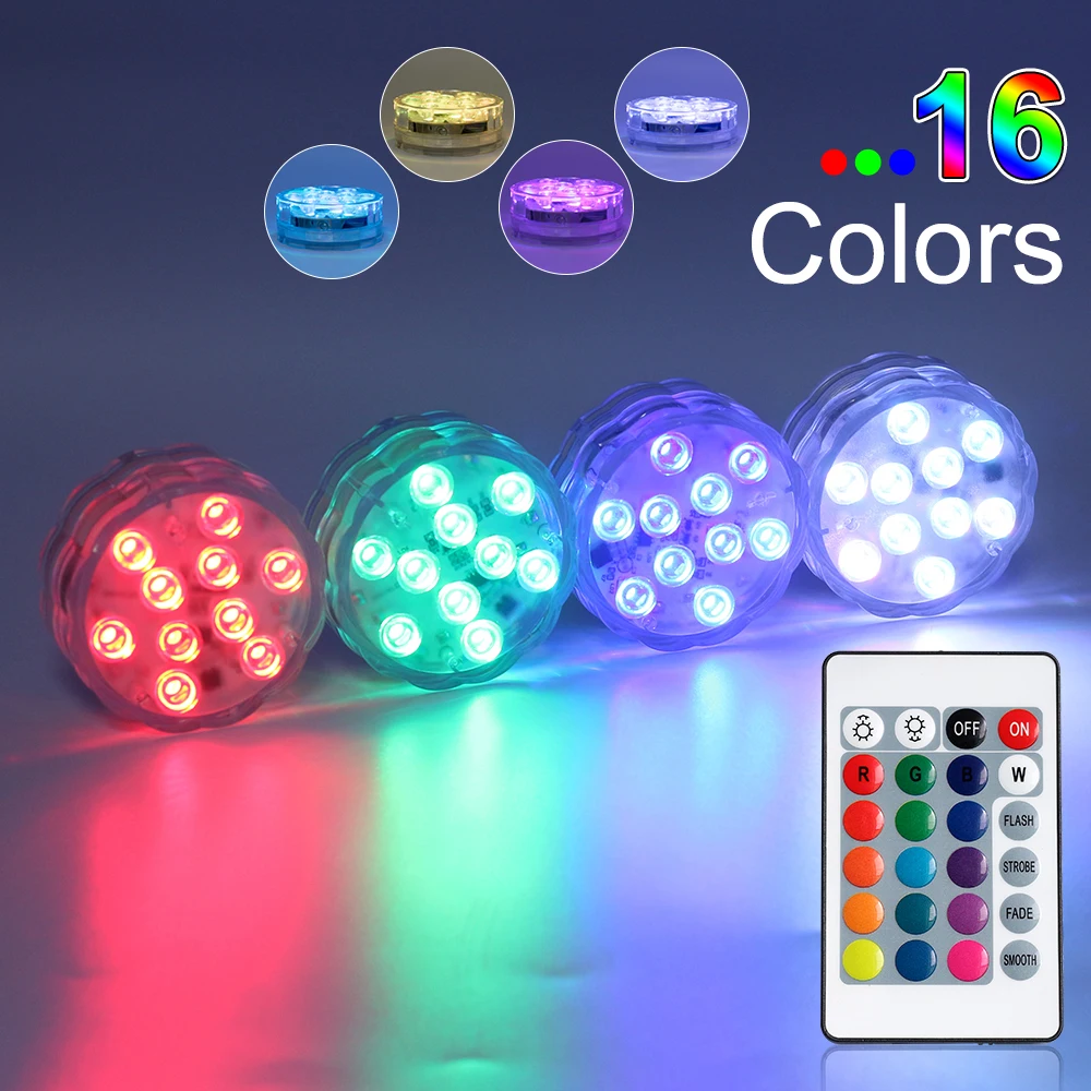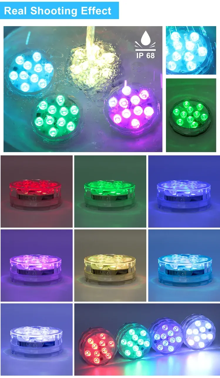 Our underwater lights are made of high-quality ABS material. The size of these Submersible Underwater Lights is 7*3cm. There are 3 battery slots and 10 LED lights inside the Submersible Underwater Lights. The shell contains a waterproof ring, which can better prevent water from entering the underwater lights. This LED dive light has 16 colors and 4 light flashing modes. This submersible LED light comes with a 24-button remote control. The submersible led lights can change color, light flashing mode, and light intensity by remote control. Submersible Underwater Lights can be used both indoors and outdoors.