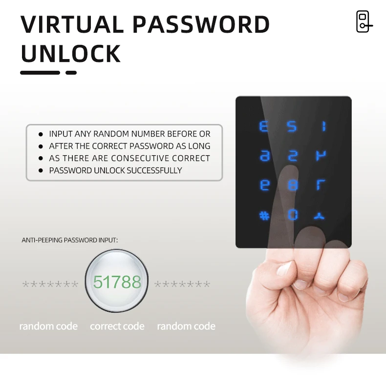 Support the Anti-Peeping Virtual Password enter, Input the random passcode before or after the correct password, This makes your