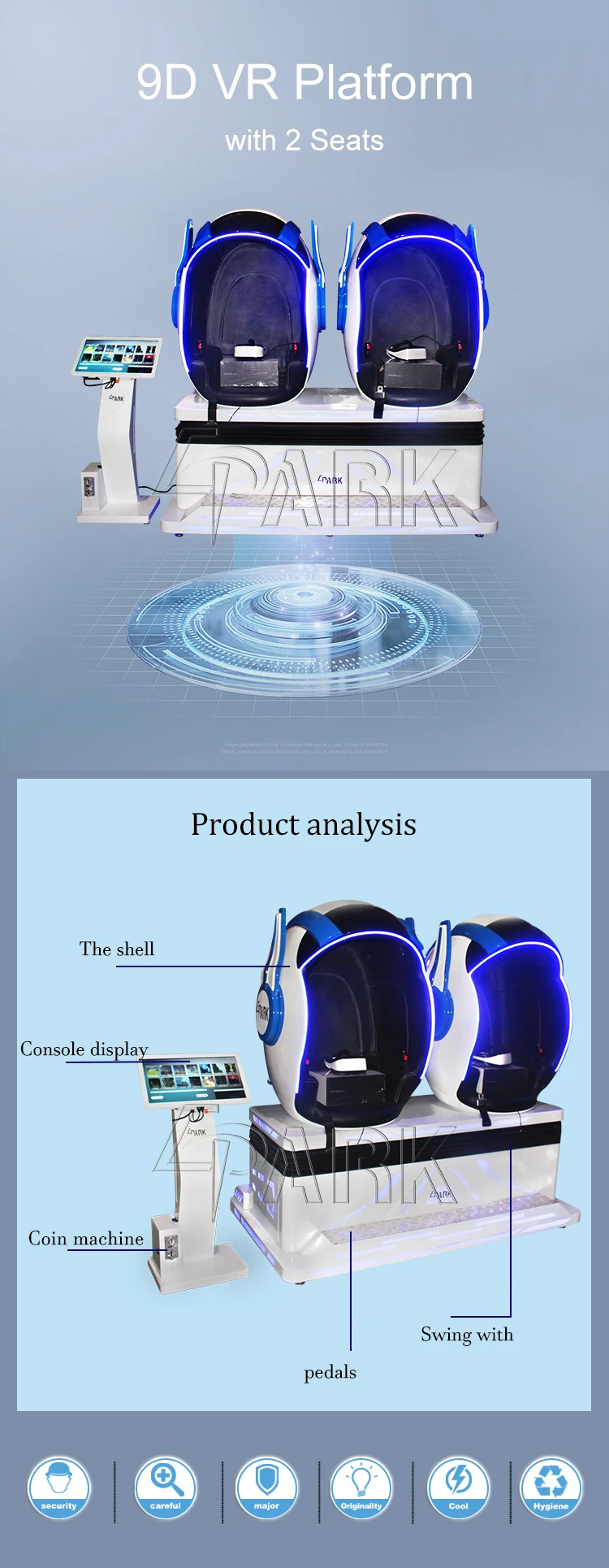 Advantages: 1. Profesional and mass different types of moives and games 2. High resolution 4K VR helmet 3. Professional environment effects 4. Consumer account function inside 5. Professional Software 6. Professional power parts + computer parts 7. Third PC system solution 8. Coin system is optional, Very convenient for the control, Save the labor cost as well 9.12 months Super warranty 10. Professional experience zone design