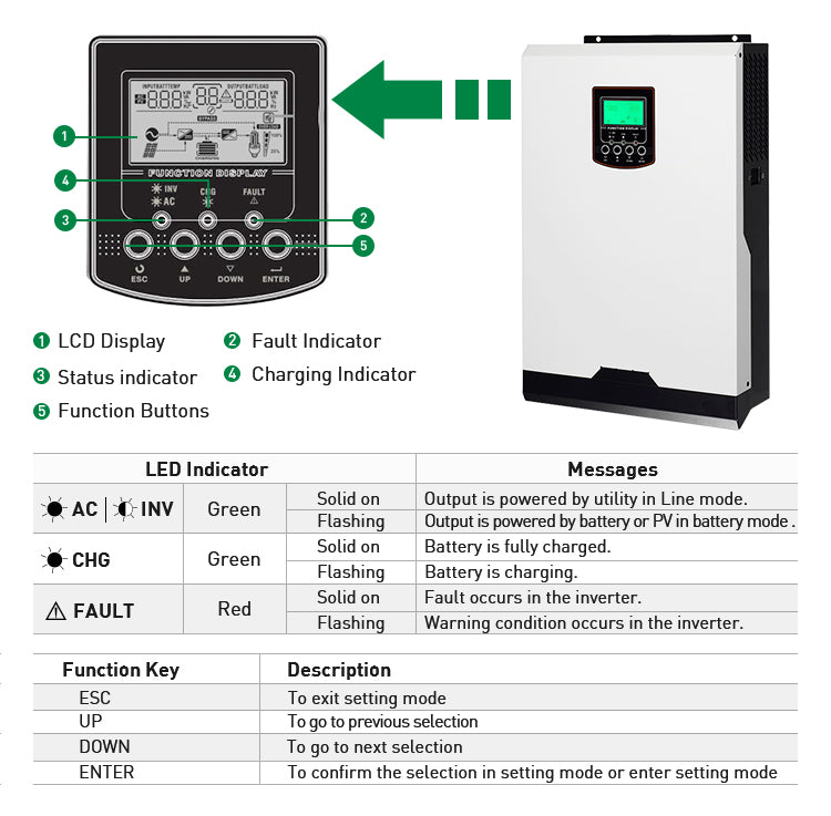 2. Configurable input voltage range for home appliances and personal computers via LCD setting.3. Configurable battery charging