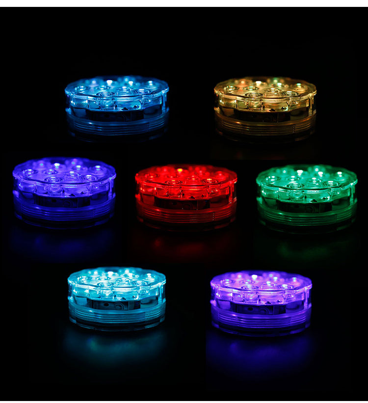 This multi-color pool light is a 16-color LED light with 3 battery slots. It contains 10 LED lights inside. This submersible LED light is suitable for a variety of scenarios, it can be placed at the bottom of a vase, used in an aquarium, or placed in a bathtub as a toy. Diving lights can also be used as coasters. Put the diving light on the table and put the cup on the diving light to achieve the effect of a coaster. This LED pool light has 16 colors and 4 light flashing modes. This submersible LED light comes with an IR24 key remote. It can be automated through this controller. Automation enables you to change colors and change flash modes with one click. This underwater light offers energy efficiency and a safer 4.5-volt connection. This diving light is suitable for both indoors and outdoors.