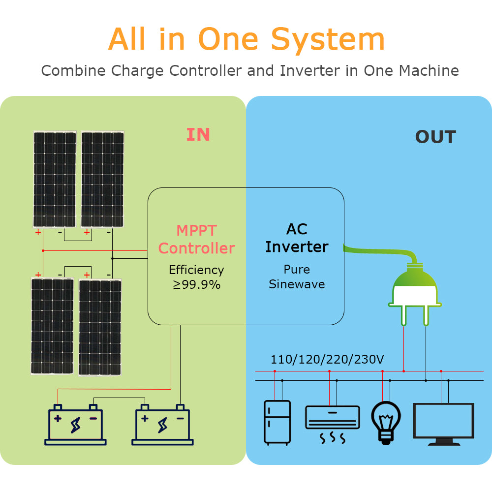 1. Pure sine wave solar inverter. 2. MPPT charger controller inside, efficiency ≥99.9%. 3. Flexible battery charging: