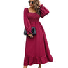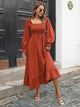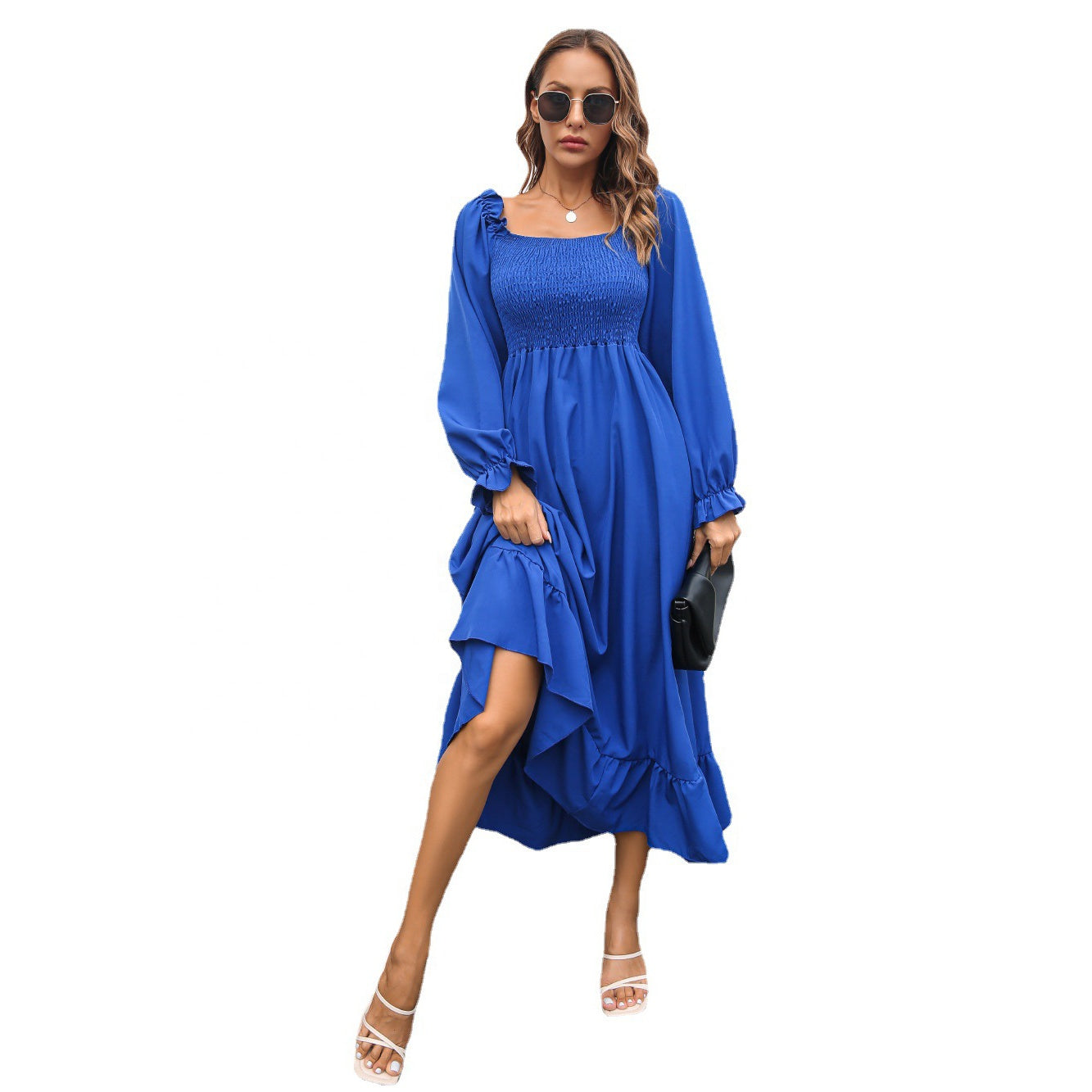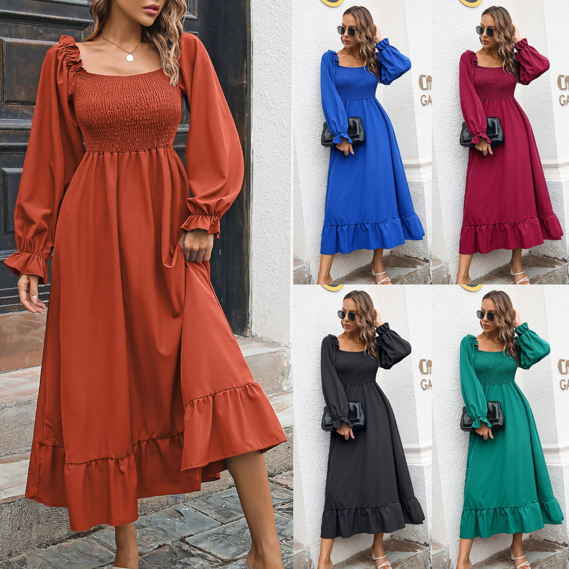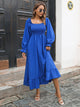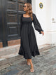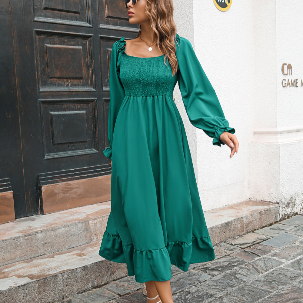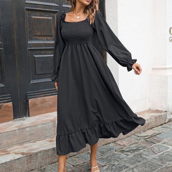 Women Autumn and Winter Fashion Elegant Chiffon Square Neck Solid Color Waist Slim Ruffle Stitching Midi Women Casual Dress